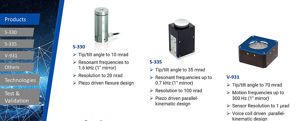 In both free-space communication applications – on earth and in space – fast laser steering mirrors (FSMs) are required to point and stabilize the beam for error-free data transmission.