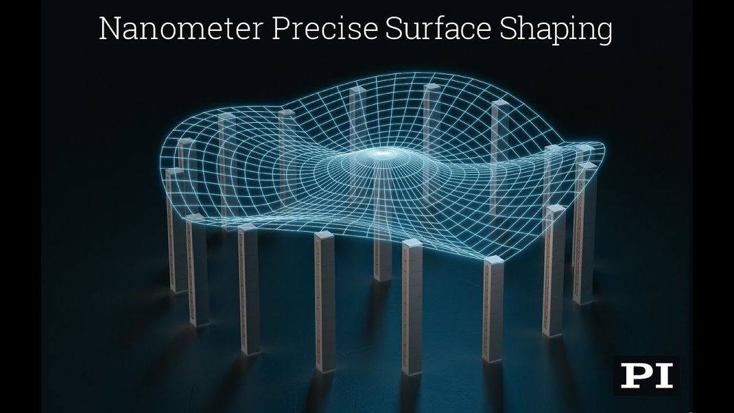 Applications of the future not only require the ability to move objects precisely, but also to change and correct the shape of surfaces. This calls for intelligent piezo system concepts. Our surface shaping technology enables active deformation of large solid plates with nanometer precision. Thanks to advanced control concepts, we achieve controlled surface profiles. Integrated high-resolution sensors, which can optionally be combined with external surface measurements, are used to calculate surface profiles and ensure precise generation or correction of long-wave deviations such as bowing and warpage. By superimposing Zernike modes and applying optimized actuation strategies, the system achieves deformations of up to 100 µm while maintaining high static forces. This approach allows for efficient targeted surface control and adaptable performance across a wide range of applications.