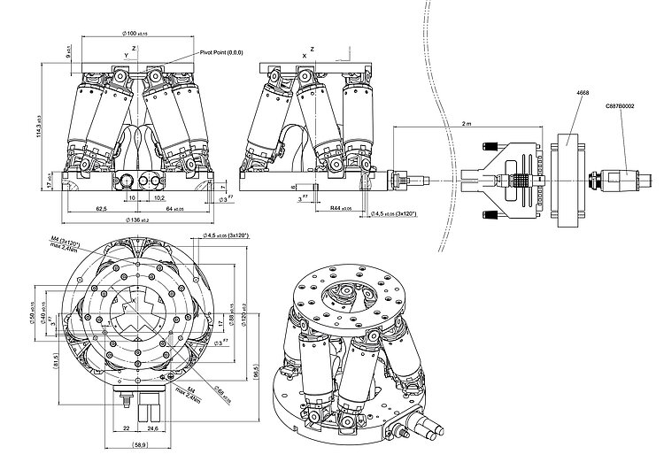 Miniature hexapod; BLDC motor; vacuum compatible to 10-6hPa; 5 kg payload; 10 mm/s velocity; 2 m cable length (vacuum side); feedthroughs. Air-side connecting cables are not included in the scope of delivery and must be ordered separately.