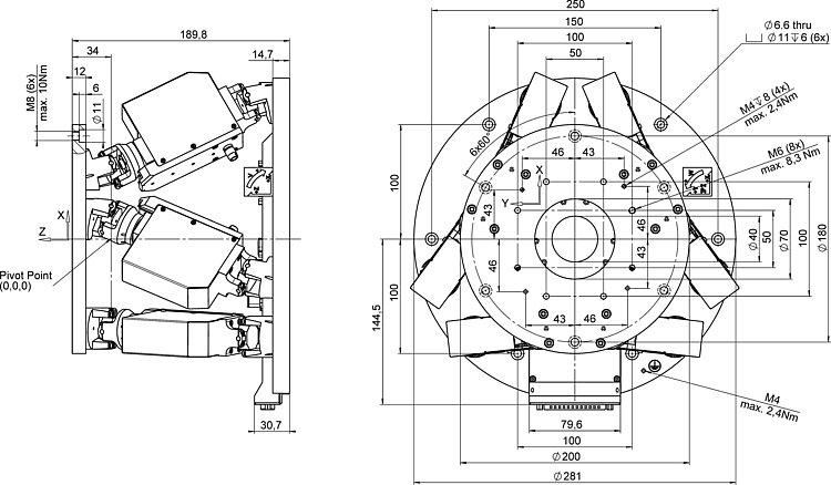 Parallel-kinematic design for 6 degrees of freedom, making it significantly more compact and stiff than serial-kinematic systems, higher dynamics, no moved cables: higher reliability, reduced friction. Compact due to folded drive design. Suitable for vacuum environments to 10-6 hPa.