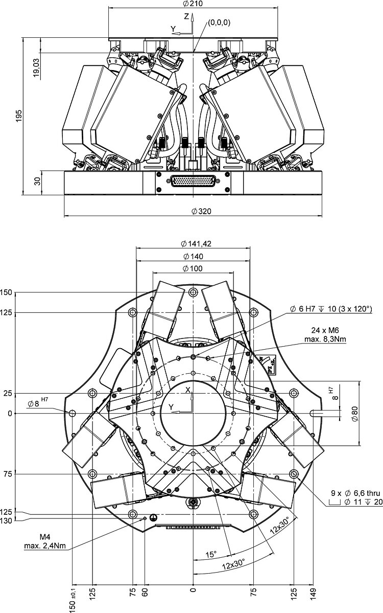 Compact hexapod; brushless DC gear motor; absolute encoder; 30 kg payload; 2.5 mm/s maximum velocity. Connecting cables are not included in the scope of delivery and must be ordered separately.