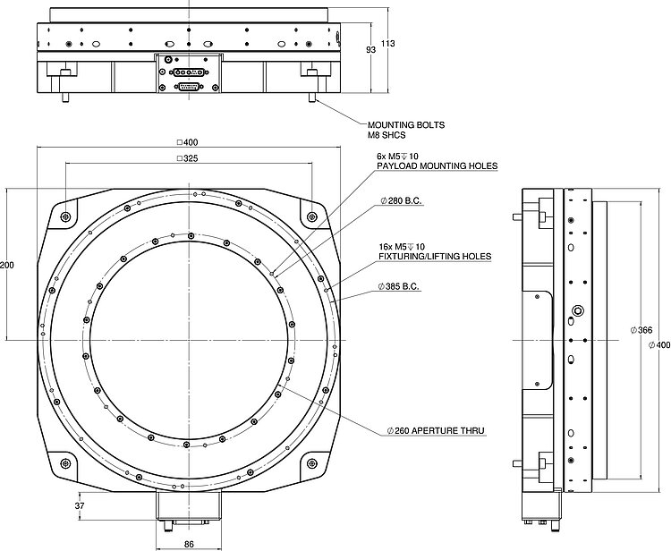- 365 mm diameter motion platform, 260 mm diameter aperture