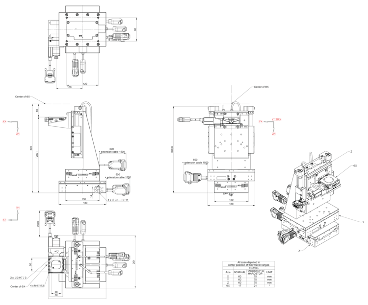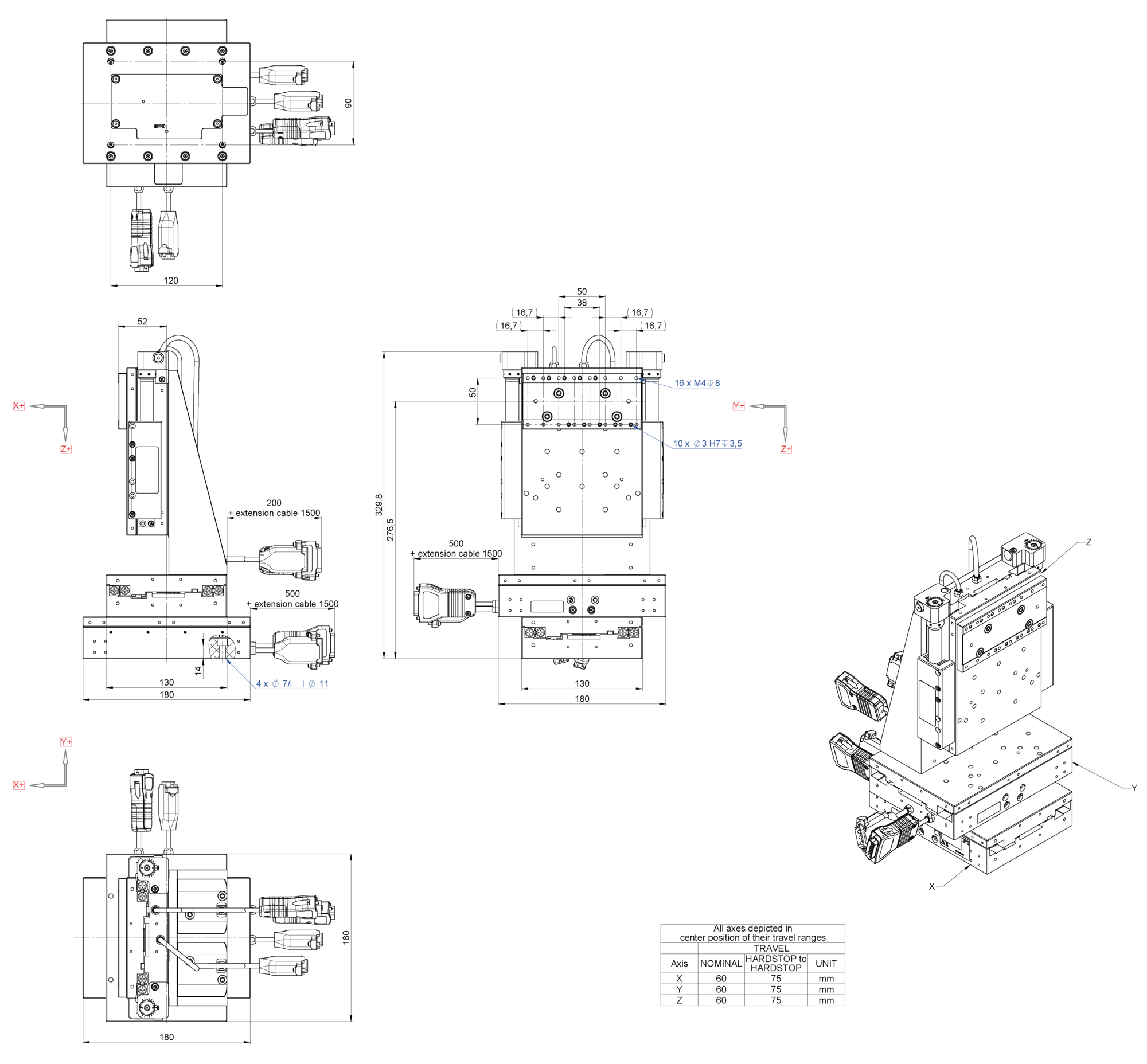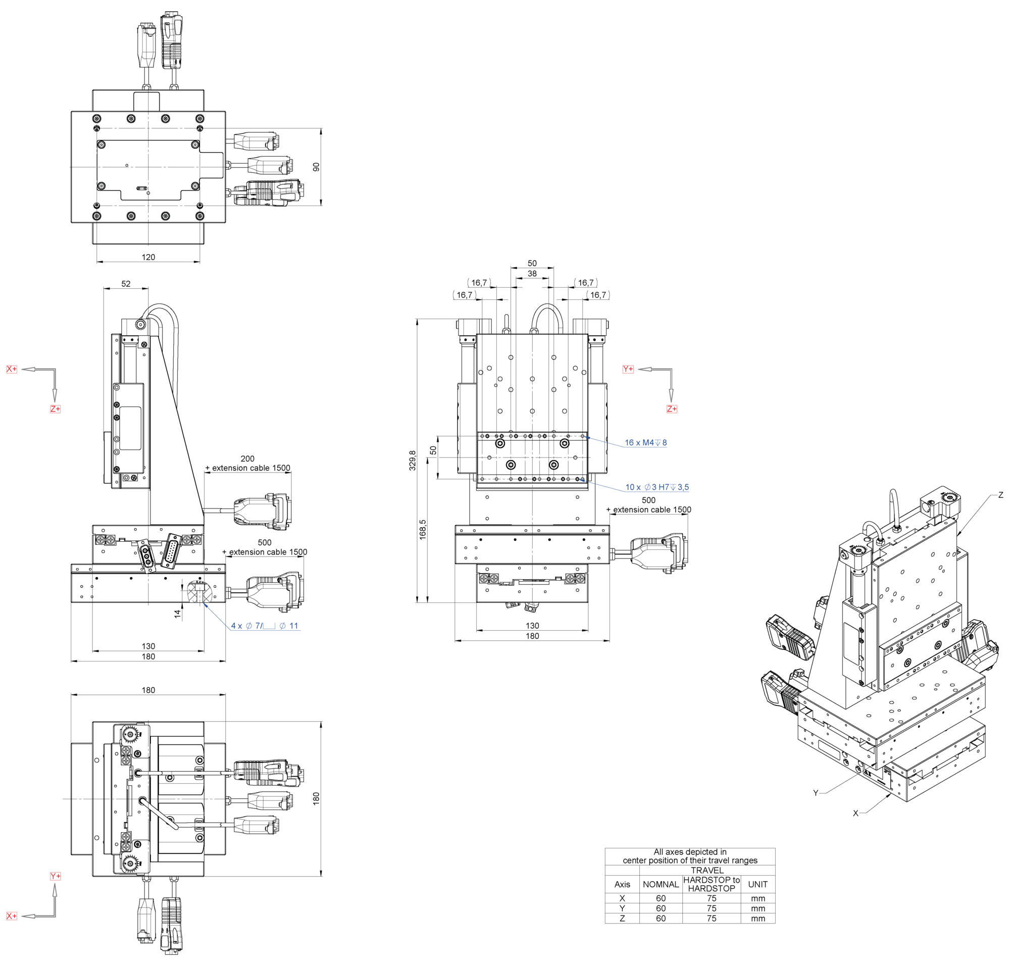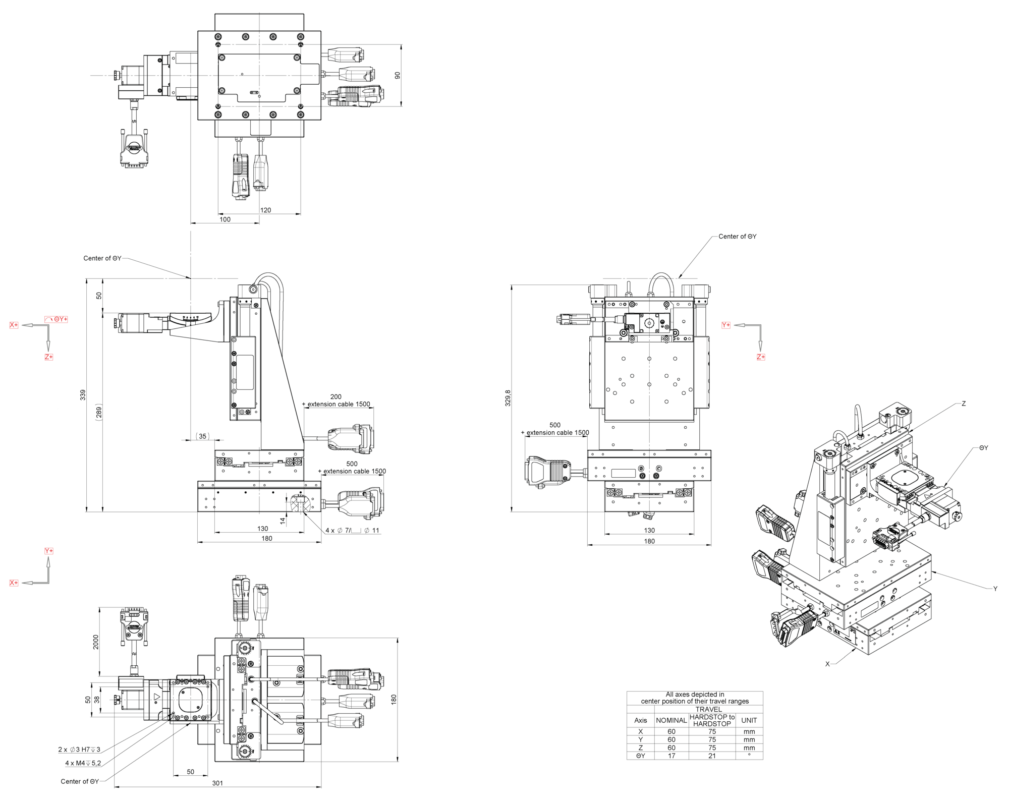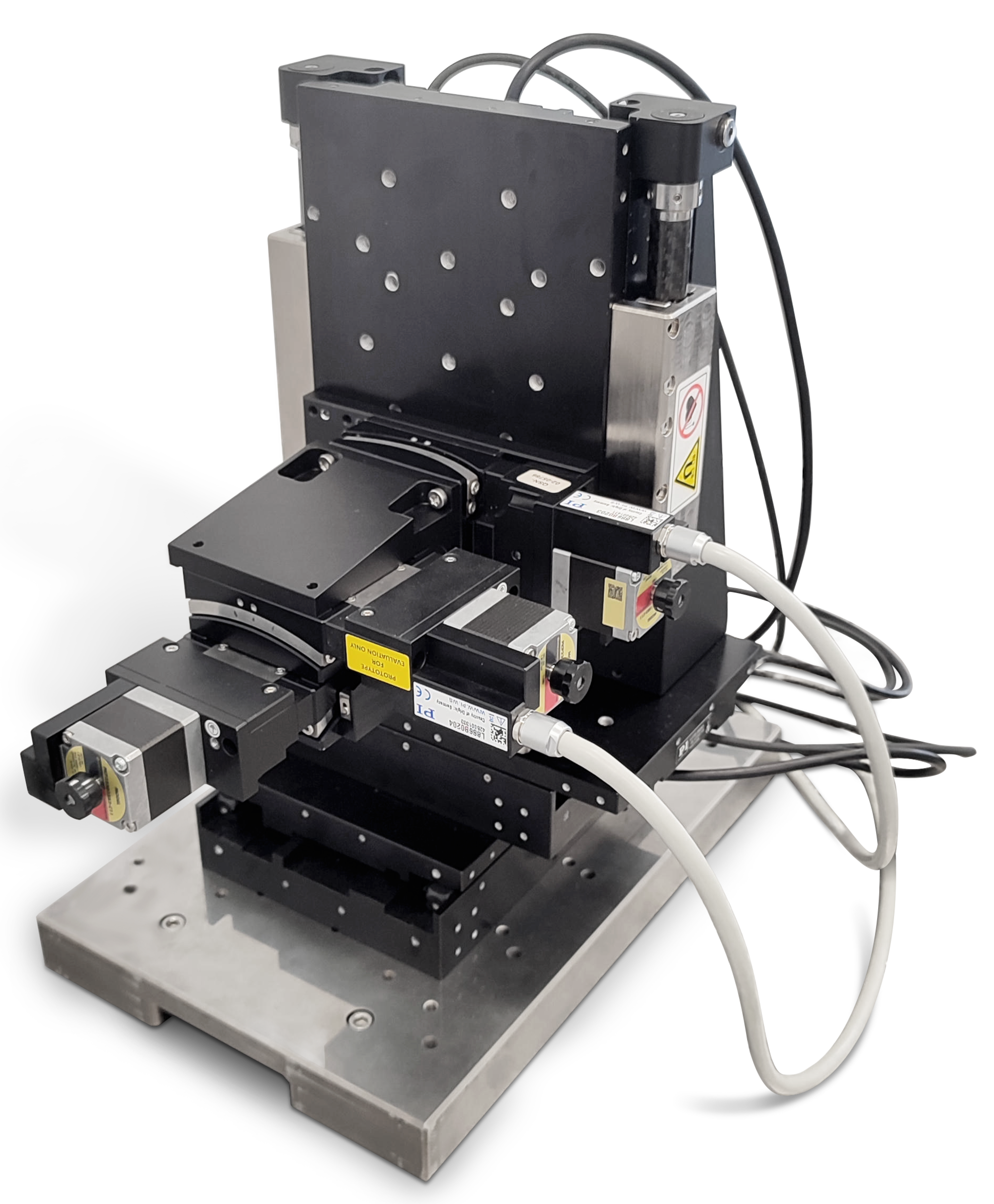Photonics alignment system with 3 linear axes: X, Y, Z; 60 mm travel range in X, Y, Z; 500 mm/s maximum linear axis velocity; 50 nm minimum incremental motion in X, Y, Z; adapter for rotational axes on top; controller included
