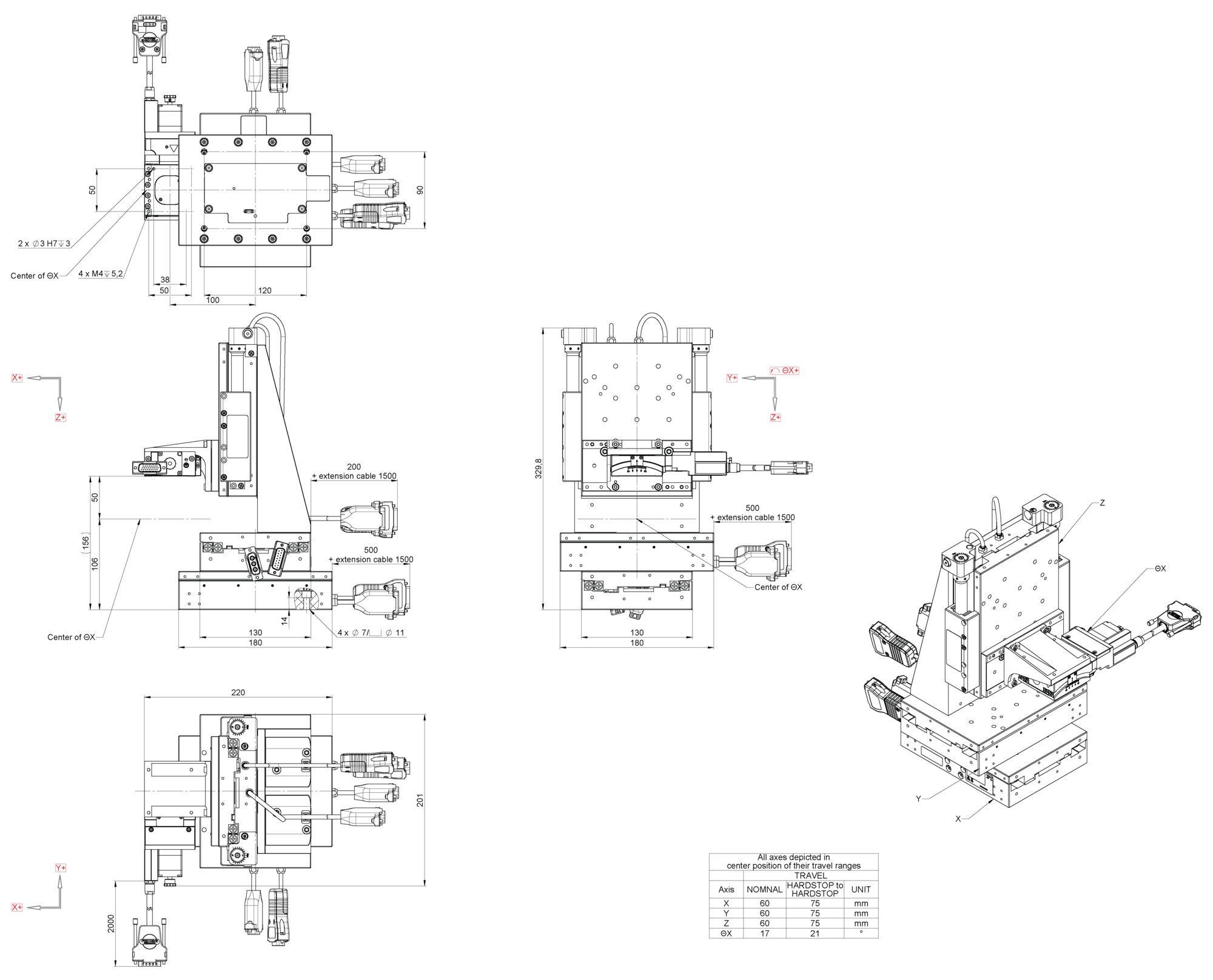 Photonics alignment system with 3 linear axes and 1rotational axis: X, Y, Z, θX; 60 mm travel range in X, Y, Z; 17° rotation range in θX; 500 mm/s maximum linear axis velocity; 10 °/s maximum rotational axis velocity; 50 nm minimum incremental motion in X, Y, Z; 5 μrad minimum incremental motion in θX; rotational axis on top; controller included
