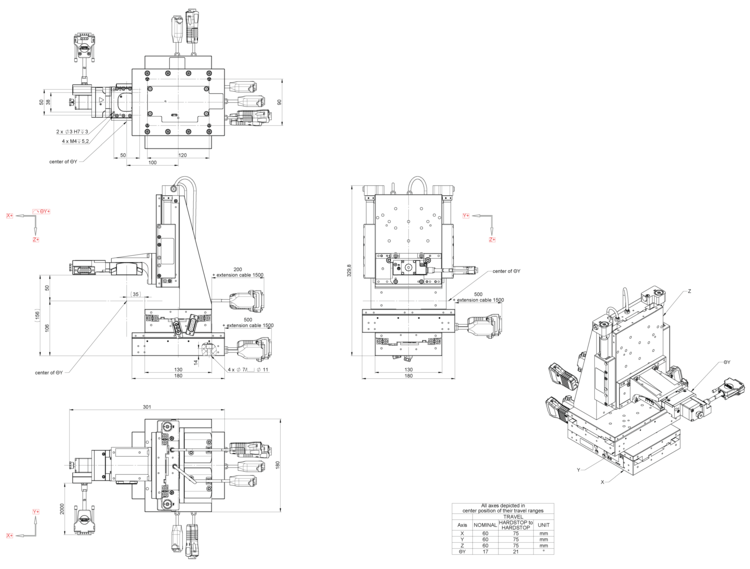 Photonics alignment system with 3 linear axes and 1rotational axis: X, Y, Z, θY; 60 mm travel range in X, Y, Z; 17° rotation range in θY; 500 mm/s maximum linear axis velocity; 10 °/s maximum rotational axis velocity; 5 nm minimum incremental motion in X, Y, Z; 5 μrad minimum incremental motion in θY; rotational axis on top; PMW amplifier; controller with PWM amplifier included