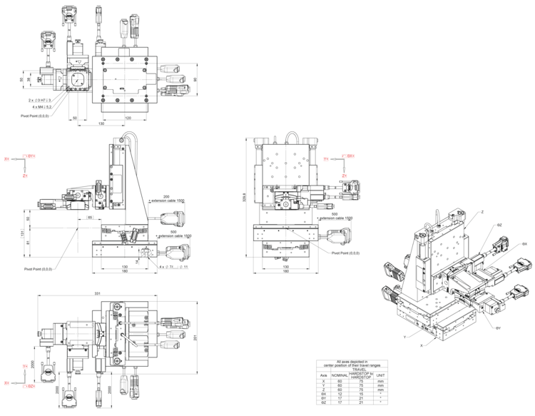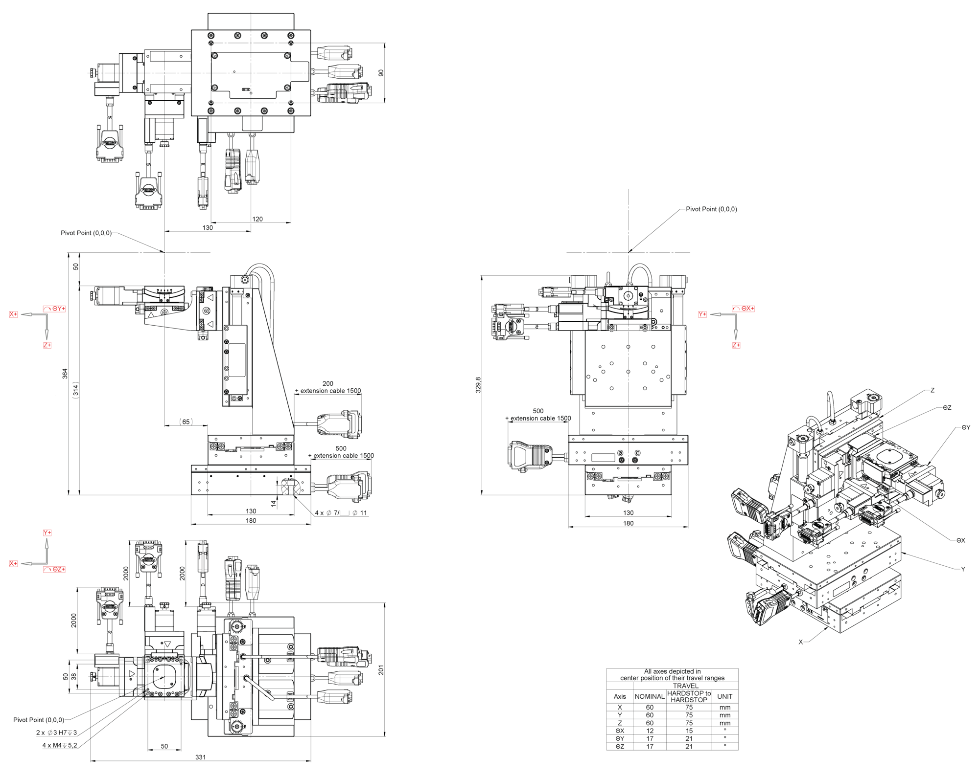 Photonics alignment system with 3 linear axes and 3 rotational axes: X, Y, Z, θX, θY, θZ; 60 mm travel range in X, Y, Z; 12° rotation range in θX; 17° rotation range in θY, θZ, 500 mm/s maximum linear axis velocity; 10 °/s maximum rotational axis velocity; 50 nm minimum incremental motion in X, Y, Z; 5 μrad minimum incremental motion in θX, θY, θZ; rotational axis on top; controller included