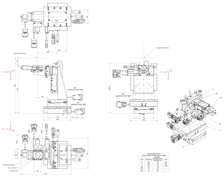 Photonics alignment system with 3 linear axes: X, Y, Z; 60 mm travel range in X, Y, Z; 500 mm/s maximum linear axis velocity; 5 nm minimum incremental motion in X, Y, Z; adapter for rotational axes on top; PWM amplifier; controller with PWM amplifier included