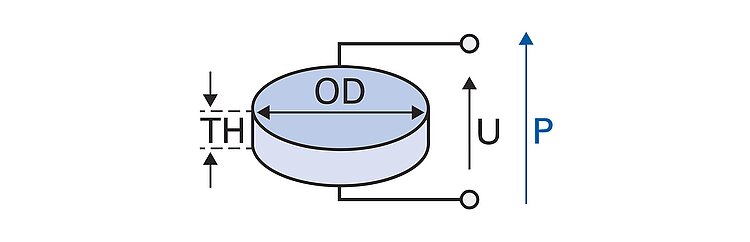 Piezoelectric disk, outside diameter (OD) = 5 mm × thickness (TH) = 2 mm, piezo material PIC181, electrode Ag screen printed
