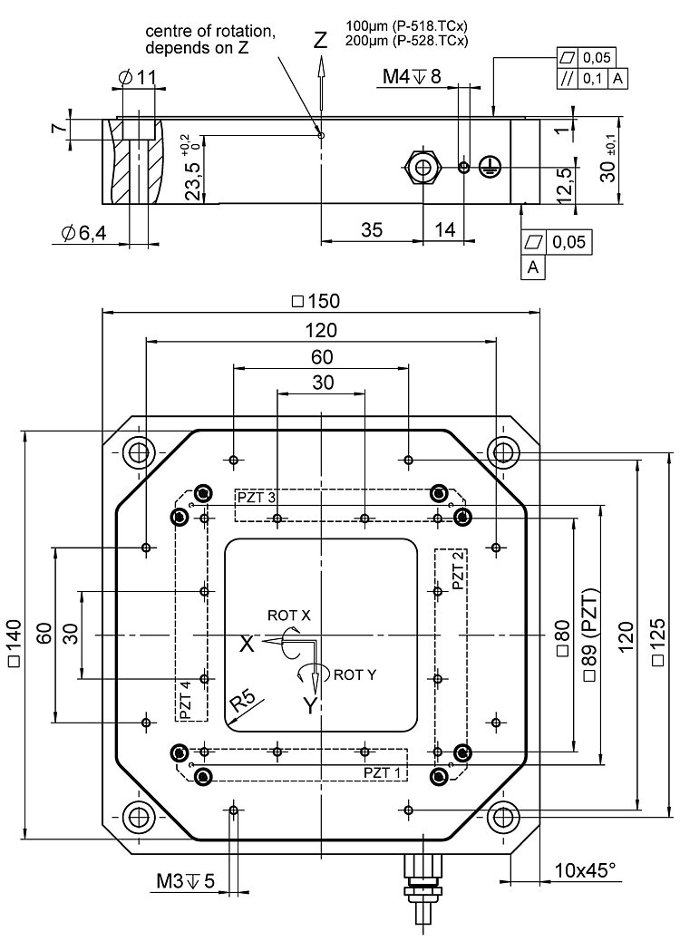 - Travel range in Z / tip/tilt angle to 200 µm / 2 mrad, closed loop (to 240 µm / 2.4 mrad open loop)