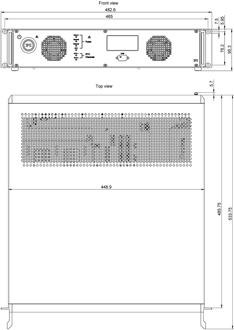 | LEDs | Status of the fuses for the 24 V power supply, STO signals, logic supply | |