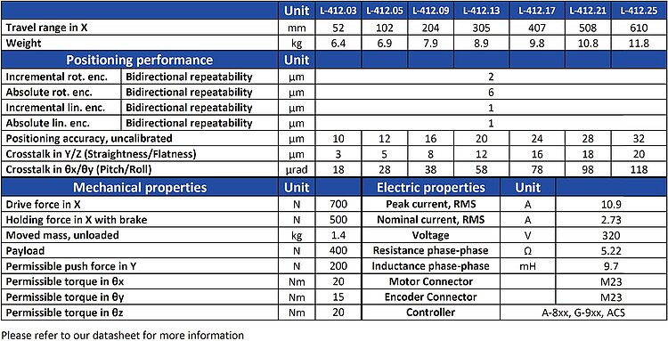 The recirculating ball bearing guides of the L-412 series are designed for high load capacity and dynamics. The high resolution of the motors allows improved tracking performance, smaller tracking errors, and improved settling times.