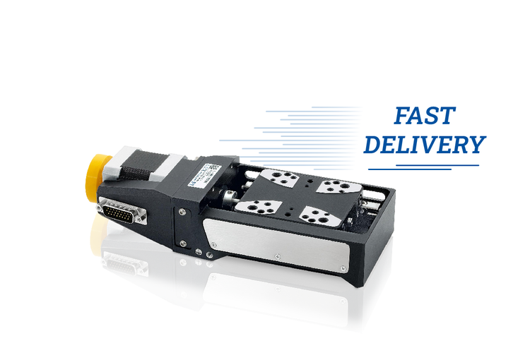 Precision linear stage; 2-phase stepper motor; 102 mm travel range; 100 N load capacity; 20 mm/s maximum velocity; ball screw; incremental linear encoder, 20 µm sensor signal period, sin/cos, 1 V peak-peak