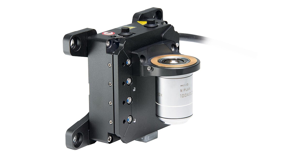 Furthermore, precise alignment of the objective along the optical axis within the lens's depth of field is essential. The depth of field can be in the range of a few hundred nanometers, depending on the lens's magnification factor. Achieving the necessary precision, speed, and dynamics is critical in this regard. This is because the occurrence of the fluorescence signal cannot be predicted precisely, and any potential tolerances of the flow cell, as well as slight pitch/yaw errors from the XY positioning stages, must be compensated for by the motion.