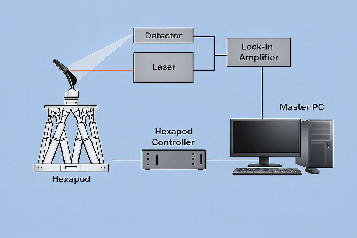 In the overall system concept, a master PC controls the complete testing setup, including the detector, laser, and lock-in amplifier. The hexapod and its controller form the motion subsystem. The laser is triggered via the lock-in amplifier, while the detector sends heat-wave propagation data back to the master PC. Motion commands are transmitted from the PC to the hexapod controller in Cartesian coordinates. The controller then performs the required coordinate transformation, calculates the trajectory, and drives the individual hexapod struts accordingly.