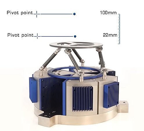 Freely selectable center of rotation (Pivot Point). In a serial kinematic system, motion is confined by bearings – and the center of rotation is related to the fixed radius of each rotary stage and goniometric cradle used. In order to move the center of rotation, mechanical changes, have to be made or fixturing needs to be modified. With a PI hexapod, a single software command can set the center of rotation to any location inside or outside the hexapod envelope. In PI’s multi-axis hexapod systems, the center of rotation can be changed by a single software command on the fly.